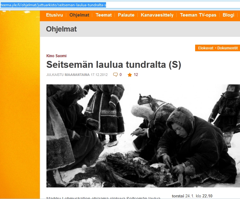 Today there will be the screening on YLE TEEMA TV of Lapsui/Lehmuskallio’s famous “Seven Songs from the Tundra”, the world’s first fiction film in Nenets language. It will also be online here.