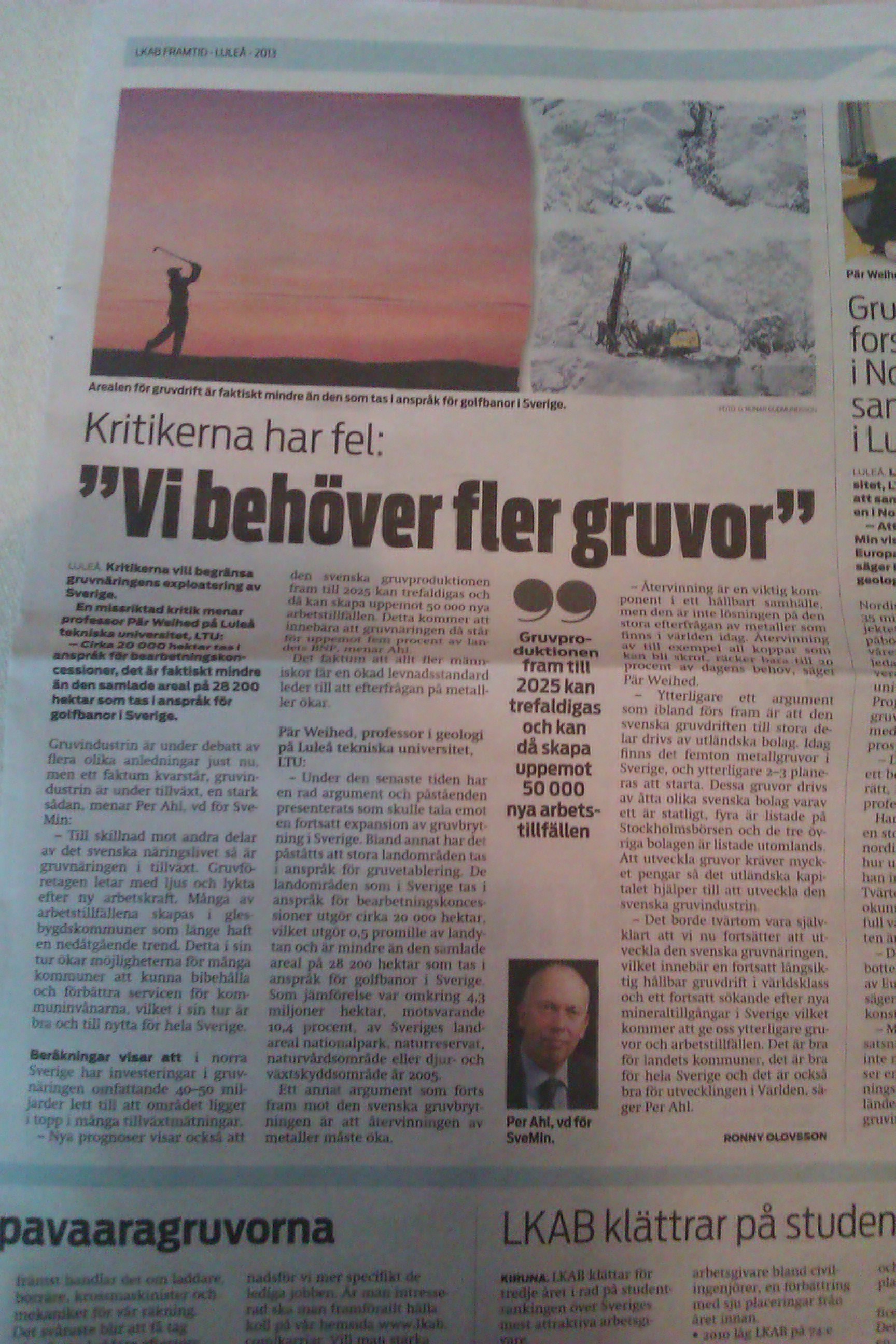 Interviewed for the newspiece “Critics are wrong […]” was director for SveMin Per Ahl, and professor in geology at Luleå University of Technology, Pär Weihed.