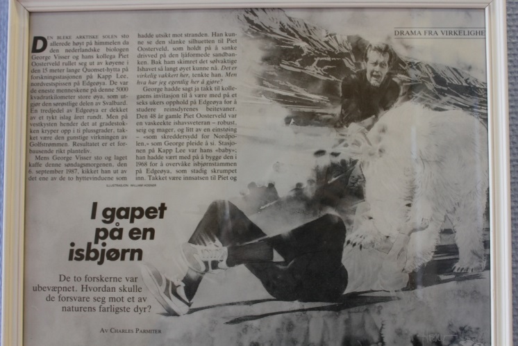 That year two Dutch biologists at the Kapp Lee station on Edgeøya, Piet Oosterveid and Georg Visser, were badly injured by this young polar bear. As Hacquebord pointed it out, indirectly, this event led to the end of a Dutch research station in the High Arctic. In 1989 it was sold for a symbolic sum to the Norwegian Polar Institute. On the instruction of Piet Oosterveld, the executive committee terminated the Foundation for Arctic Biological Research that supported his research activities, thus putting an end to one of the most important Dutch research initiatives in the Arctic since the Second World War. (Hacquebord, L. 2004. Permanence in diversity. A life in the service of Arctic Biological Research. Boschman, N., Hacquebord, L. (eds). 2004. Permanence in diversity. Netherlands Ecological Research on Edgeøya, Spitsbergen. Groningen: Arctic Centre, RUG. p.10).