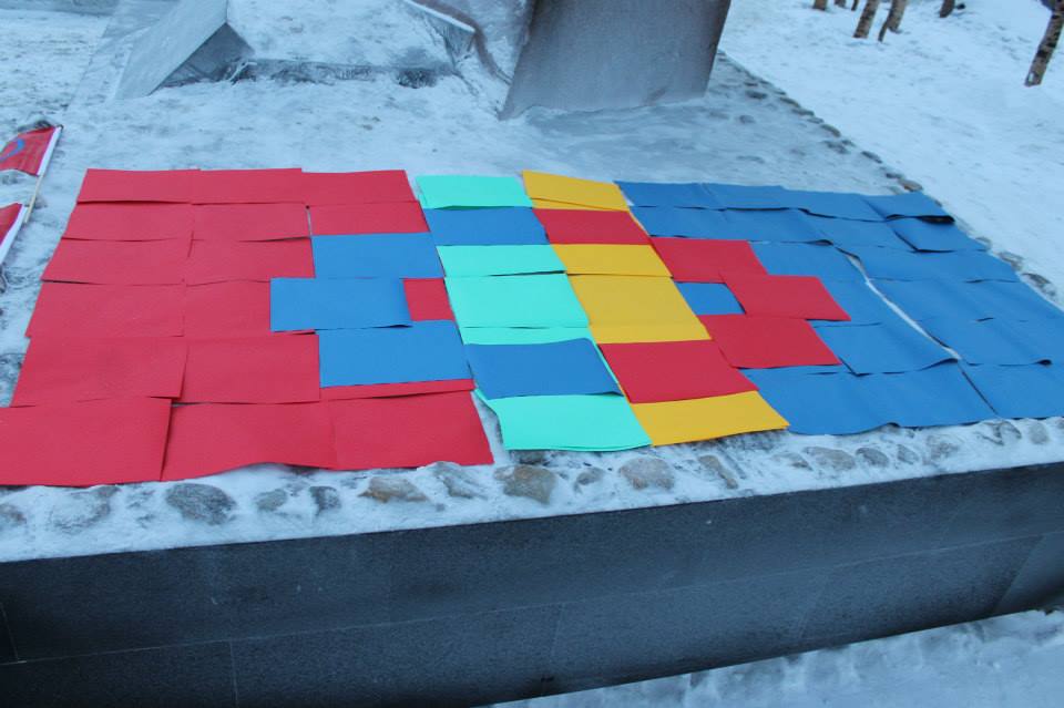 The “retaliation measures” by the Sámi activists have been astonishingly peaceful and colourful: The flashmob, which had been organised using the social media, had the aim to create a “living” Sámi flag. They preferred not to act illegally and stay at the officially sanctioned place near the Seamen’s house, and therefore the location and the attention by passers-by were not really great. The circle in the flag, unfortunately, didn’t work out too, but the idea was positive and beautiful. It was in the (at least Eastern) Sámi-like spirit of a soft and peaceful resistance.