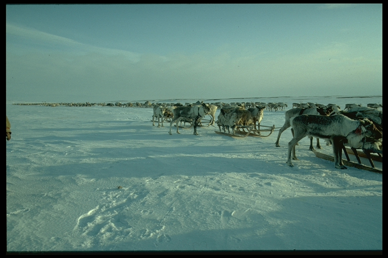 I remember well when we were moving up north in Yamal (West Siberia) in April with friends Tokcha Khudi and Anatoli Tynzikovich Vanuito, rushing in order to cross the big Yuribei River before it breaks up. We would sleep long in the morning, then pack up the camp at daytime while it was nice, sunny, warm, and the snow was melting, letting the reindeer graze in the soft snow while it was warm.
