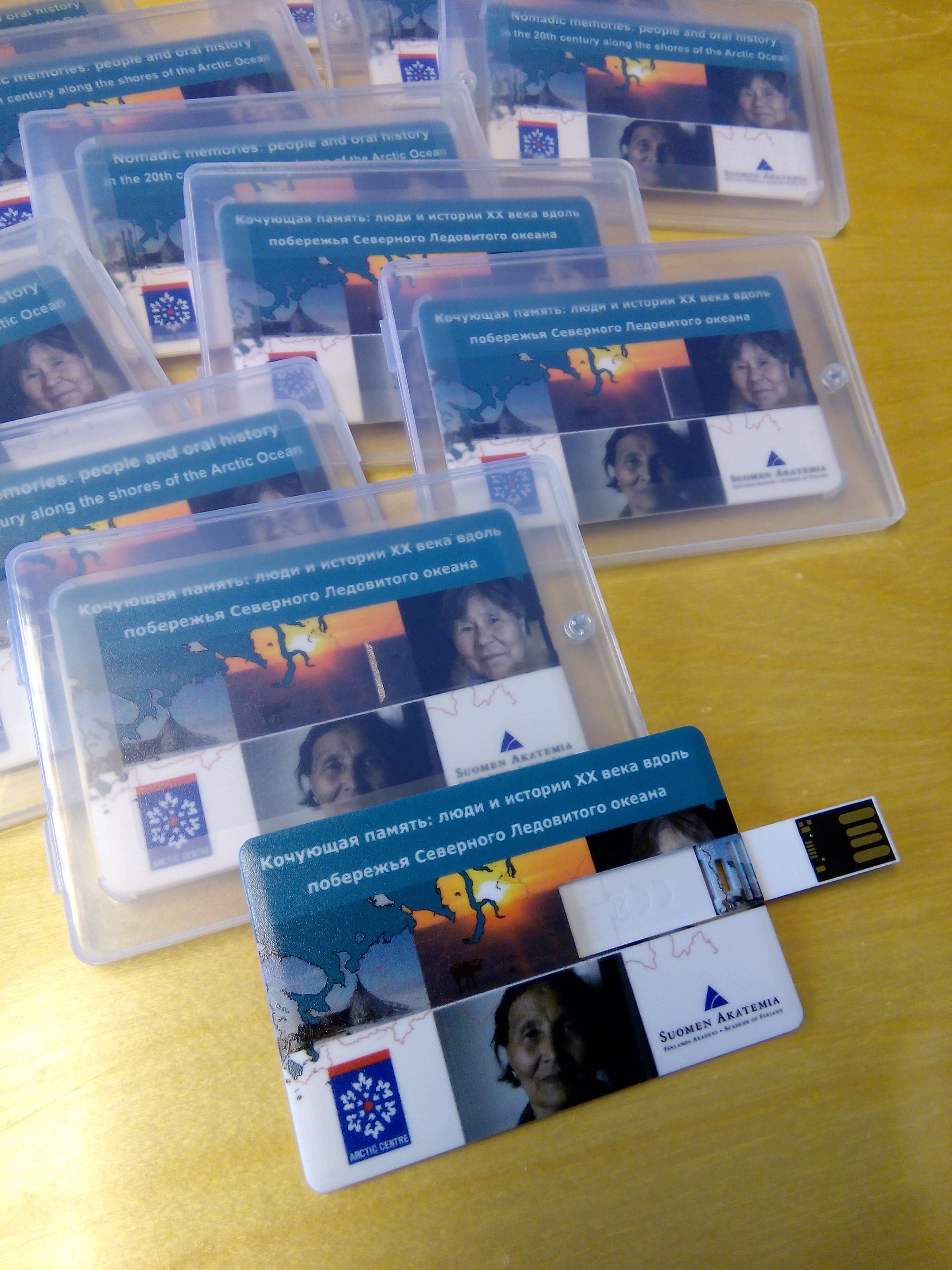 But why a USB stick and not, for instance, a web site? The USB stick is the first step in the popular dissemination of the results of our project. From the outset of our four-year oral history endeavour, it was a primary goal to bring our results back to those people who made our research possible at first hand. The USB stick is a format which allows accessing the information wherever there is a device like a computer or a tablet, even without an internet connection. In fact, even in the remotest tent on Yamal peninsula, families today have such devices, but due to the absence of mobile network coverage they mostly don’t have internet. For the younger generation, it will be a fun way to explore their elders’ past, which – as many told us – is interesting to them, but in the everyday routine only rarely becomes a matter of common conversations. For all generations it will be interesting to compare the stories from their community with fates from other people and places of the North. In the next months, we will go back to our corresponding research areas and disseminate the stick among all our contributors. By bringing back some of our results we also want to express our gratitude to our interlocutors. Special acknowledgement also goes to Stephan Dudeck and Antti Tenetz who dedicated many hours to designing and correcting the actual content of the stick. Without them, our common baby would never have become reality!