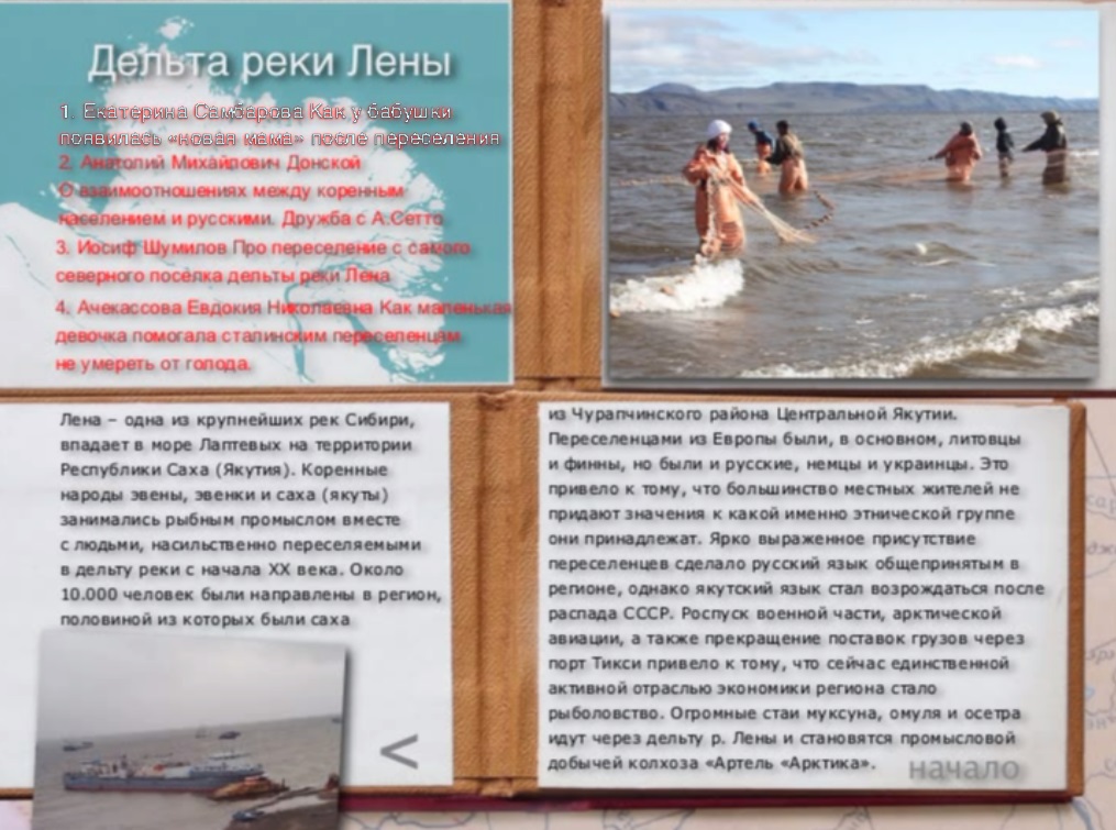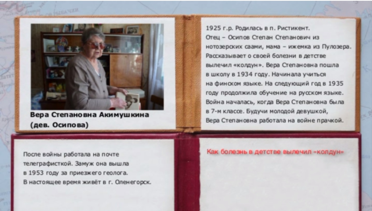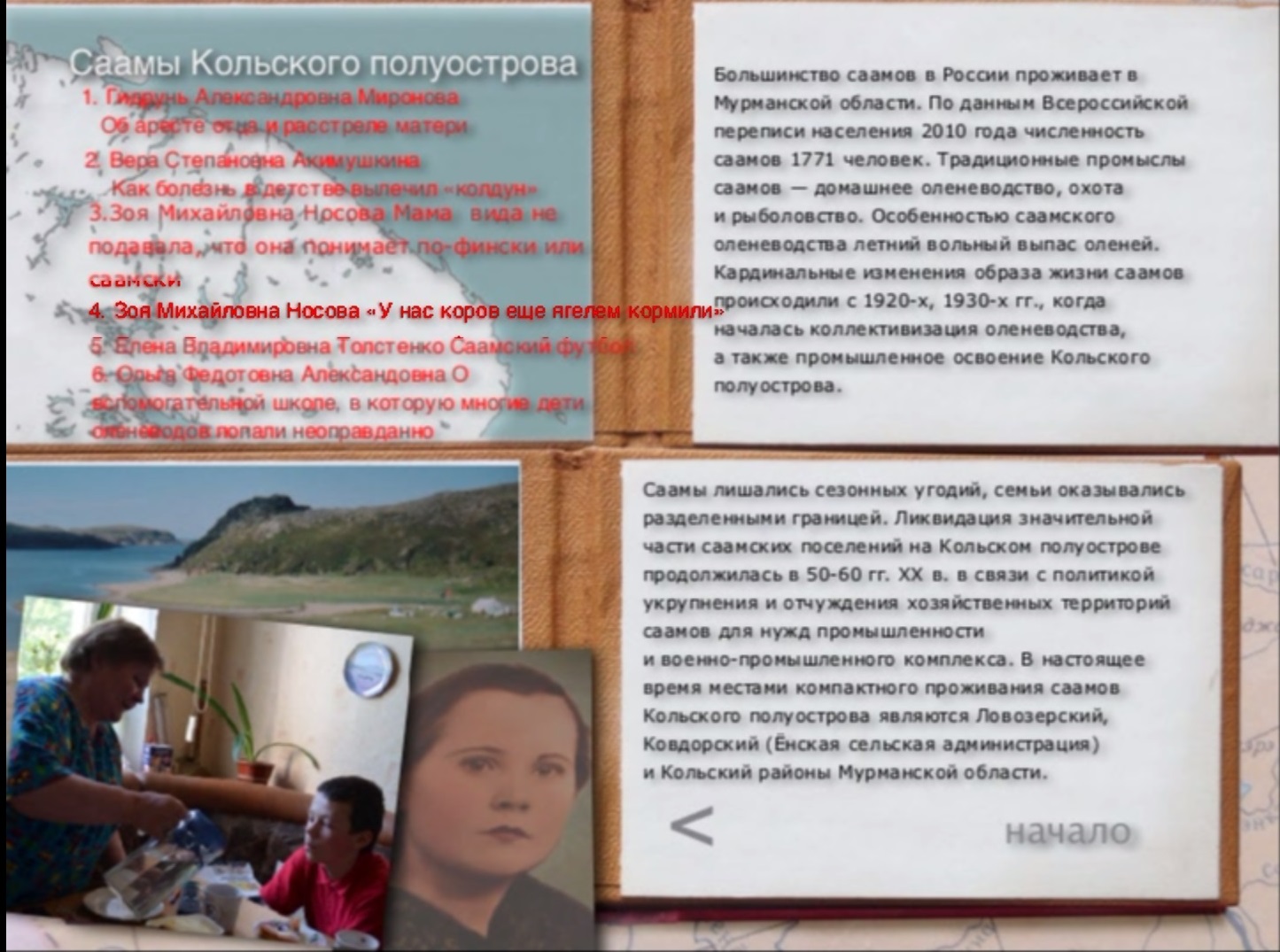 В коллекцию мы включили как веселые, так и грустные истории от людей, ставших свидетелями огромных социальных, политических и экономических перемен в течение их жизней. Можно посмотреть и послушать рассказы о Второй мировой войне и о сталинских репрессиях, о жизни детей в школах-интернатах, о ядовитых частях ракет, падавших на просторы тундры, о саамском футболе, о медвежьей охоте, о многоязычности в повседневной жизни, о родах в тундре, а также обо многом другом. Однако красной нитью по многим историям из всех исследованных регионов проходит тема переселений коренного населения. Она оказалась самым наболевшим из множества потрясений, принесенных ХХ веком.
