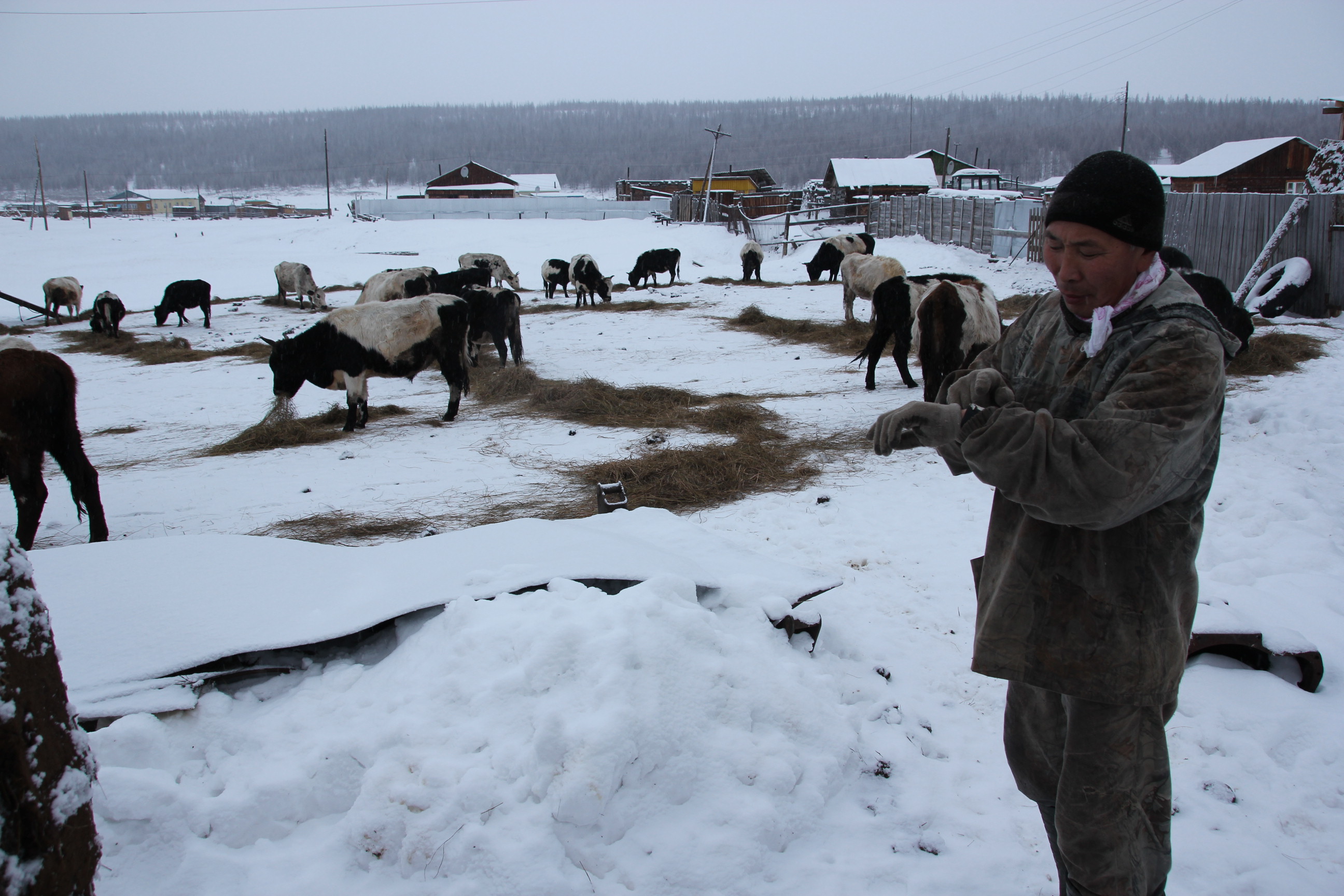 When these two cows finished eating and move on to a house themselves, I follow them, and see in front of his house a young guy feeding food to cows. He kindly invites me in when I express my interest. His name is Nikolai Baishev, the world’s youngest farmer of Yakutian cattle. He was just 22 years old when he started officially farming, but in fact he has done this his entire life, as his 64 years old mother xxx had worked her entire life with cows – and many generations before her too. They are one of those families who kept at least some private cattle even throughout the Soviet Union when private property was heavily criticised by the authorities.