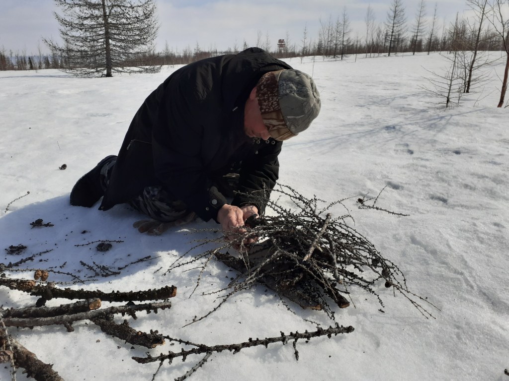 Vasily and I went to fetch firewood, dry larch twigs, while Mikhail was preparing the meal for the spirits, consisting of frozen raw fish (khalya) and frozen raw reindeer meat (aibat). All of us were city-people, not very well versed how to talk to the spirits. Therefore Mikhail had got in touch with Alexei the shaman again and for advice what to do. After lighting the fire, all of it turned out to be very straightforward: we should just invite the spirits for a joint meal at the sacred site, showing them our gratitude and our respect. We were having a nice meal ourselves, and offered at the same time that same meal to the spirits, at the bottom of the larch tree. Each of us tied some ribbons to the the larch, saying our own words of gratitude.