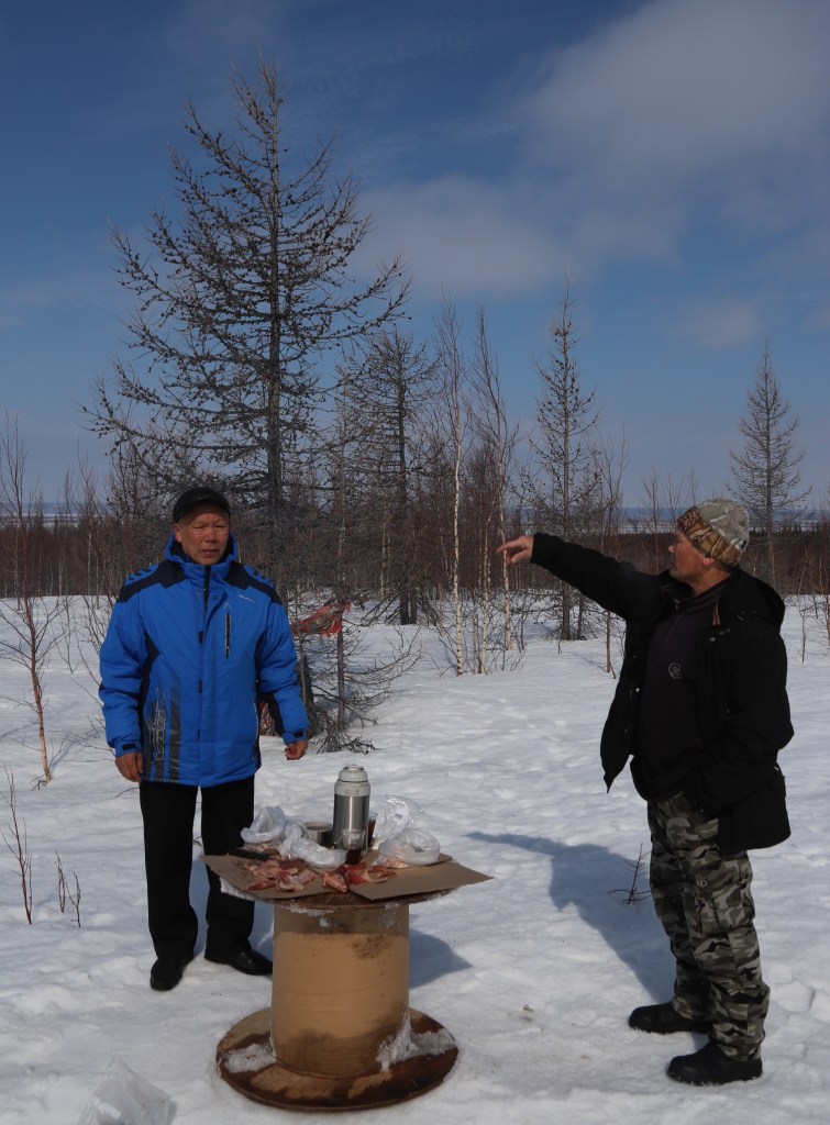 Yesterday the city of Salekhard lost one inhabitant due to covid 19. Immediately yesterday they were searching for the sacred site, but got lost, broke in to the too soft snow that is still half a metre deep, and they did not have food with them. It was clear that the spirits did not want to admit them so spontaneously and unprepared. So they tried again today. They had even found a wooden cable-drum, which would serve well as an altar for the ritual.