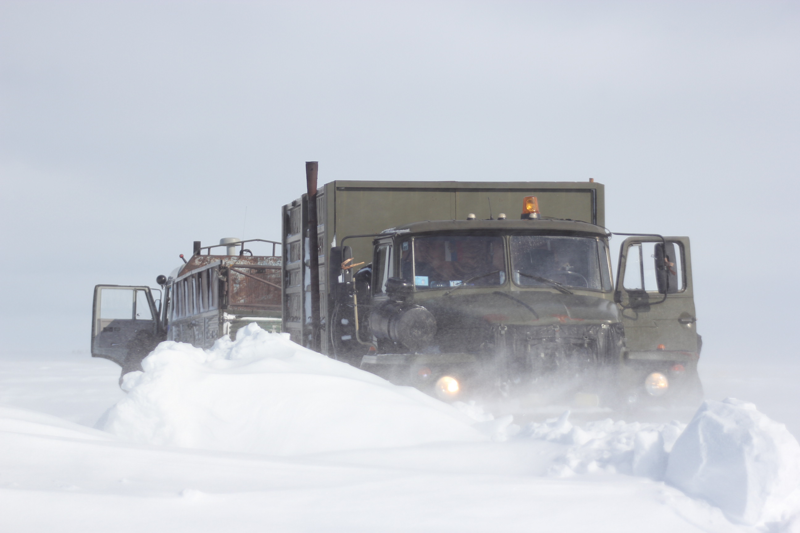 The result of this is besides global warming very concrete: these Arctic Rivers are crucial in winter as ice-roads, and the thinner their ice is, and the earlier they break up, the less cargo you can bring on these ice-roads to all the settlements along. In the main reindeer herding headquarters of Yamal, Yar-Sale, the winter road was closed for cargo trucks officially all year. This was unheard of. No big trucks allowed there, like the one that pulled us out once when we were stuck for a night in a snow storm back in 2012 (see pic).