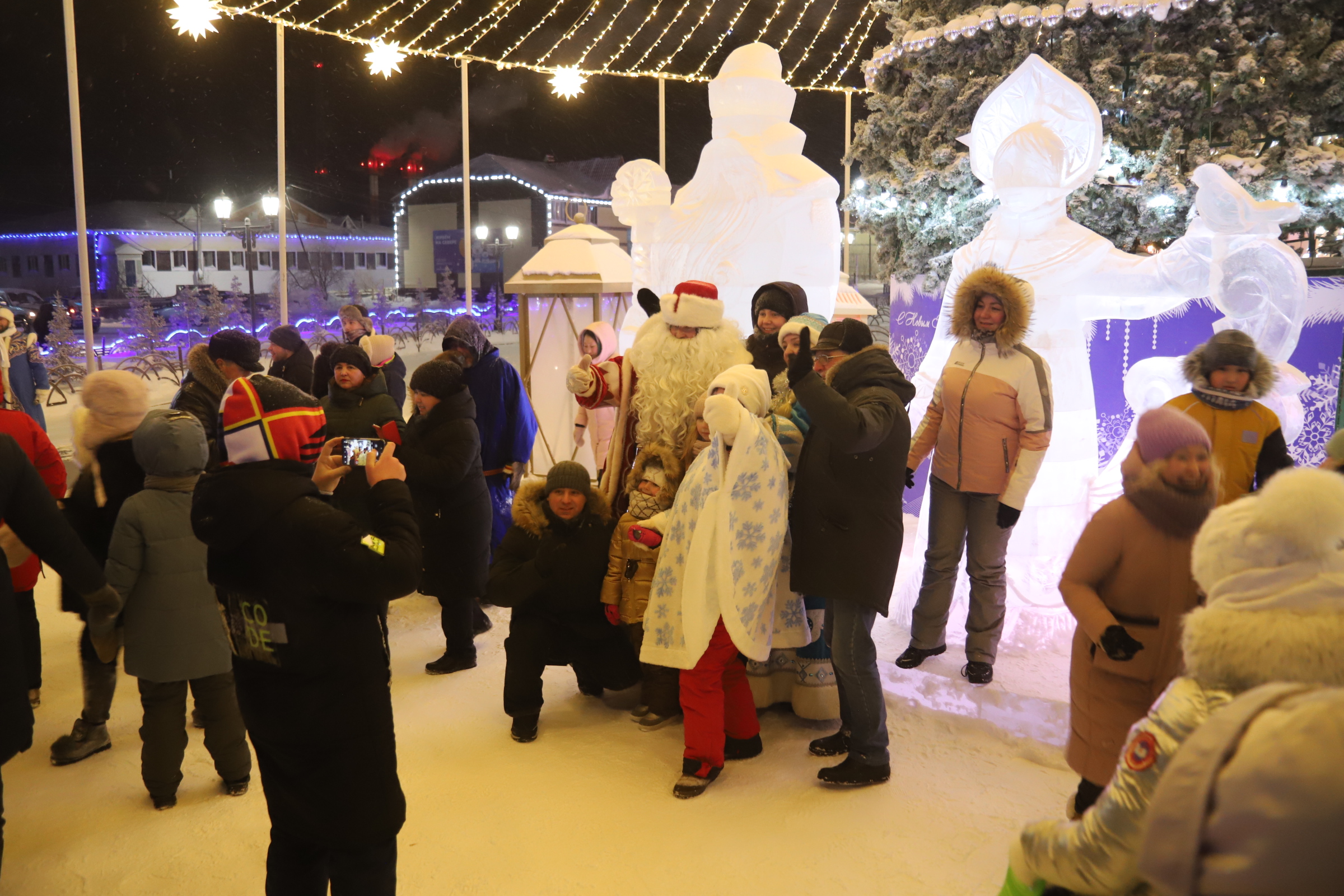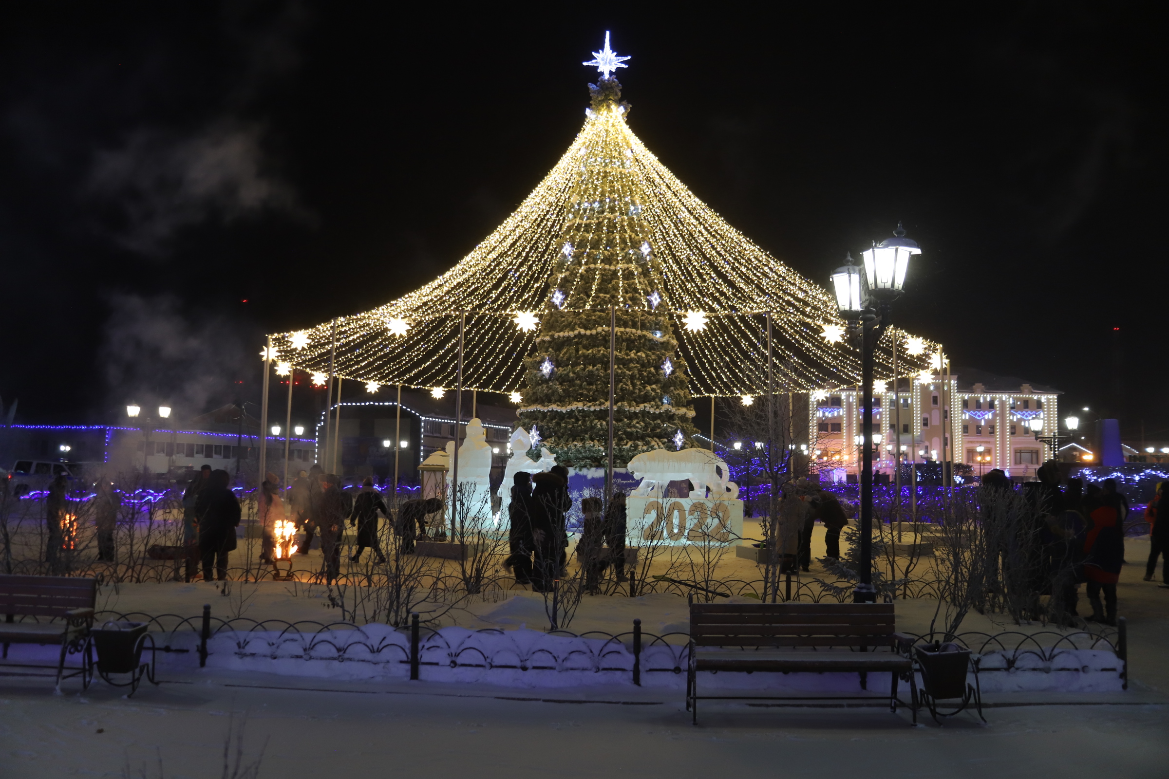 The new year’s eve proper was quite an experience, in Yar-Sale, the capital of the Yamal Peninsula municipality. They installed really nice ice-art outdoor on the main square. After midnight many people gathered there under the big lit tree. In Russian it’s not called christmas tree but New Year’s Tree.