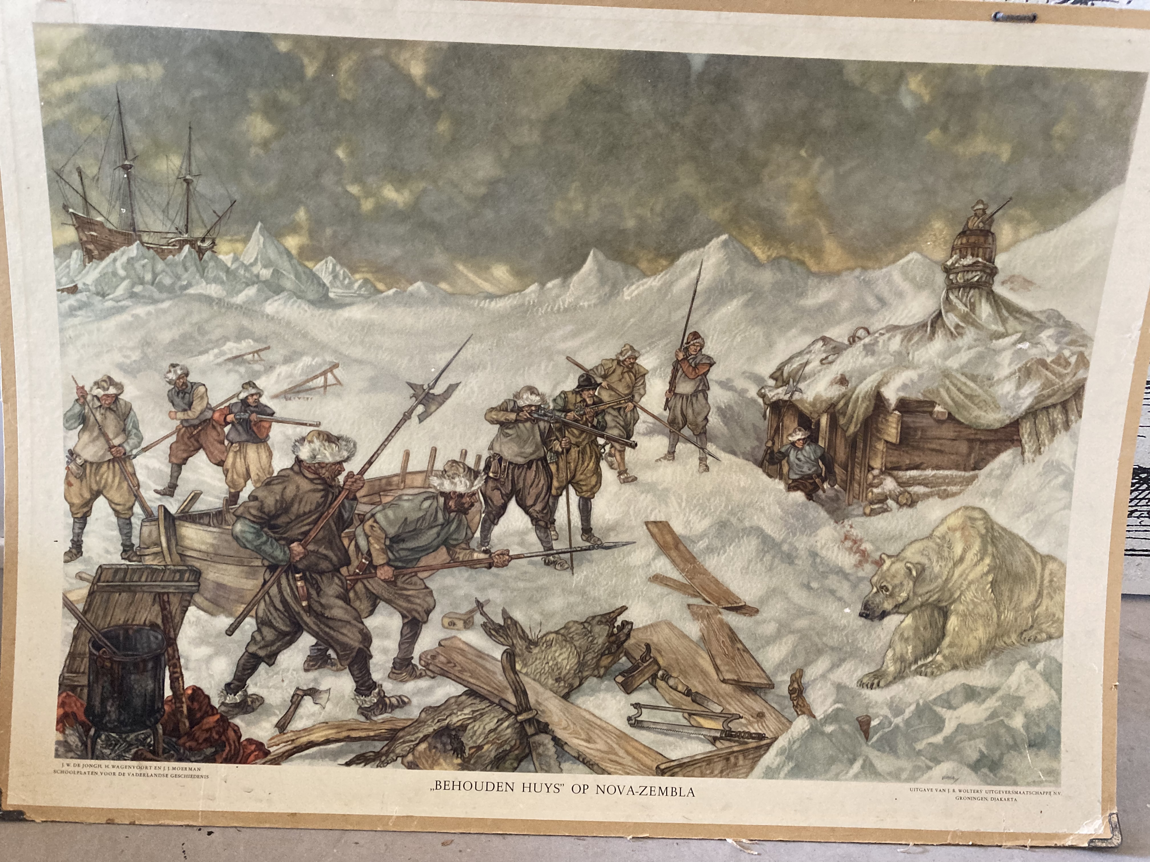 Willem Barentsz reached Novaya Zemlya on 17 July 1596. He tried to avoid becoming entrapped in the surrounding ice but their ship became stuck within the many icebergs and floes. His crew of 16 man was forced to spend the winter on Novaya Zemlya. The crew used driftwood and lumber from the ship to build a 7.8×5.5-metre lodge, which they called Het Behouden Huys (The Saved House). There was enough food for the first time. The ship bore salted beef, butter, cheese, bread, barley, peas, beans, groats, flour, oil, vinegar, mustard, salt, beer, wine, brandy, hardtack, smoked bacon, ham and fish.