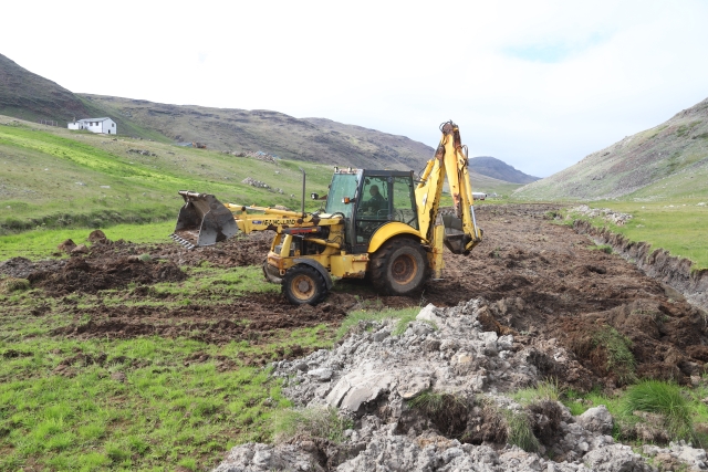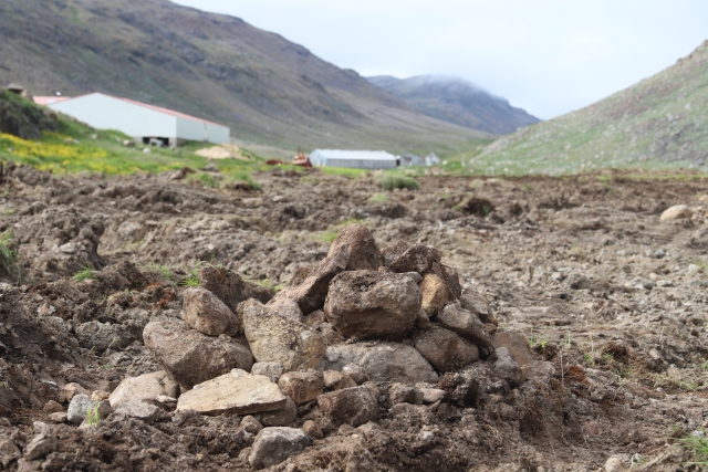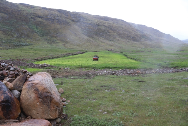 In the lowlands, the farmers fence off patches of land where they grow hay for the winter for their sheep. But not only is summer the time of hay-making. Preceding that has is field work as literally as it gets: working with your own hands on the field, in order to prepare the land for growing hay, which nowadays is moved by tractor and rolled up in bales and wrapped in plastic like elsewhere. But that field work is first and foremost a stony process – again quite literally: the soil dynamics in South Greenland has it that the land moves, and rocks raise from the ground in regular intervals. In order to keep a field viable for producing hay, these rocks need to be removed, which is mostly a manual operation: only big boulders heavier than a person can lift are removed by tractor. The rest of the rocks we remove by hand, sometimes using a heavy iron pole as a tool to dig them out from half under the ground. On a field that can extend several hundred meters in length, this is a process of many person-days of work. As a first step, a tractor goes through the field and digs out larger rocks that stick out of the ground.