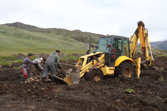 In this physically hard, slow and tedious process, I realise that this is the most literal “field work” I have every made. It is also very different from the previous fieldwork in human-animal relations in the Arctic that we work on in our current WIRE project. With hunters or herders in most of the Arctic, field work involves living with people and animals on the land, but rarely if at all actually digging into the land with your own hands, and uncovering rocks from half underground. May this be one of the reasons that the Inuit that keep sheep in this challenging landscape in South Greenland are called sheep farmers, and not sheep herders? Although they also herd the sheep in the fall back to their homesteads using horses and dogs – like many other herders.